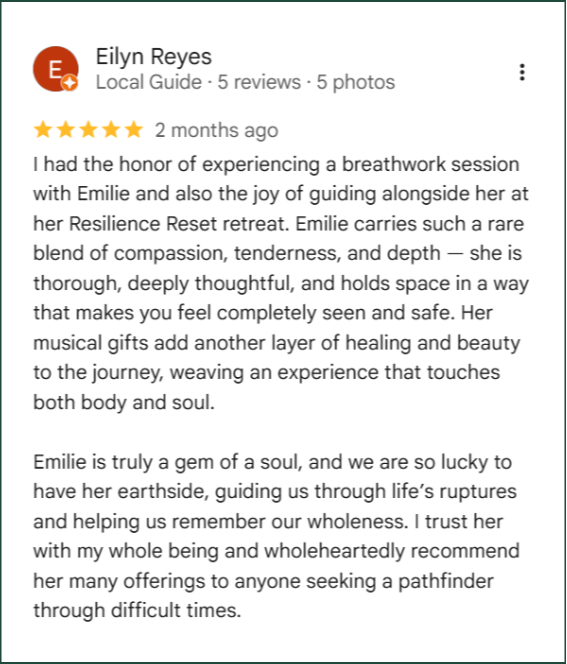 Experience trauma-informed somatic coaching and deep healing with Emilie. Whether you seek recovery from burnout, to process grief, or simply to step away from the noise , your journey here is thoughtfully crafted to meet you where you are.